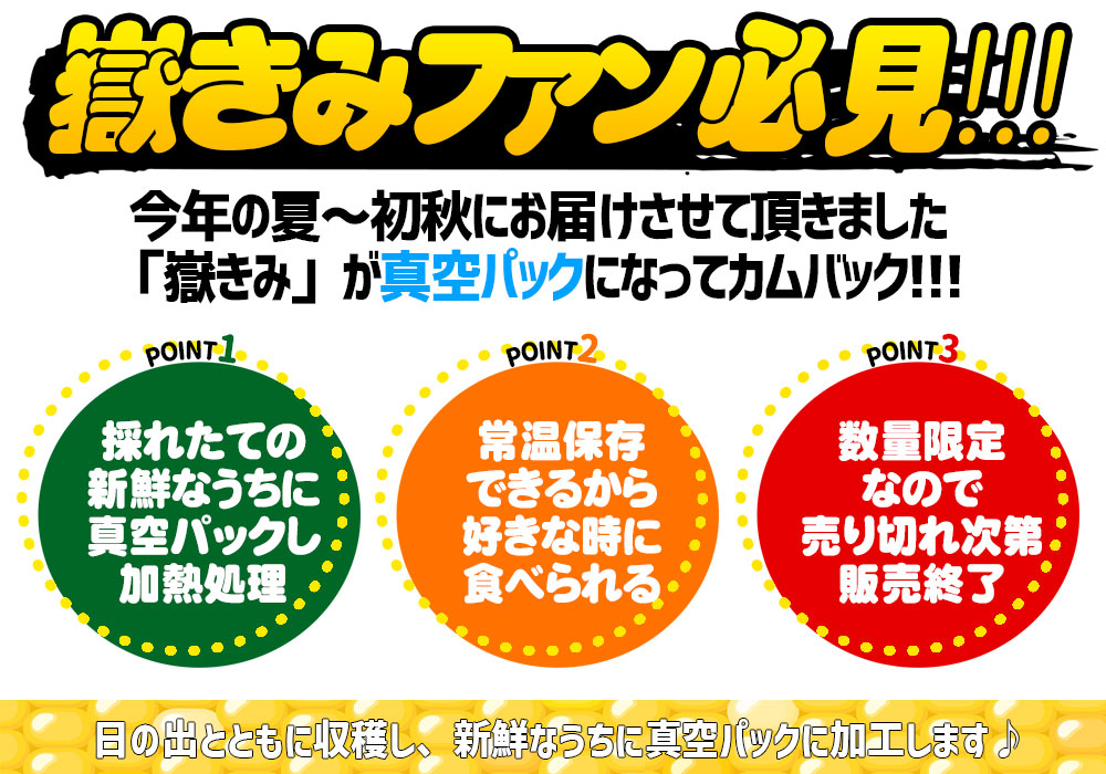 | 嶽きみの収穫最盛期を迎える8月中旬。 一番味がのって美味しくなったタイミングを逃さず日の出とともに収穫し、 その日のうちに加熱真空パックに加工! だから活きてるプチプチ食感! それが、嶽きみ真空パック(^0^)/ |