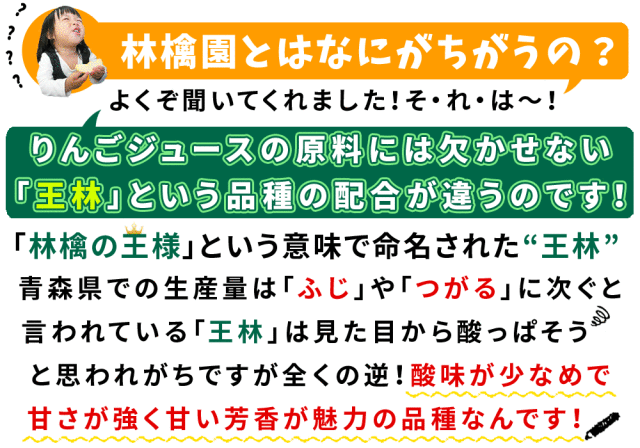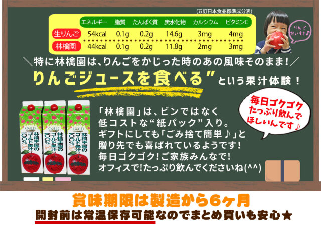 | そのため、「林檎園」に比べると少し甘めの コクのあるブレンドに仕上がっています! 甘めといっても、もちろん! 1gの砂糖も1滴の水も加えていない りんごの原料のみで調整をしているので、 完熟りんごそのままの味わいです! そして、「林檎園」よりさらに原料を厳選して搾った ワンランク上のプレミアム果汁となっています。 小さなお子様からご高齢の方にも 大変喜ばれているりんごジュースです♪ |