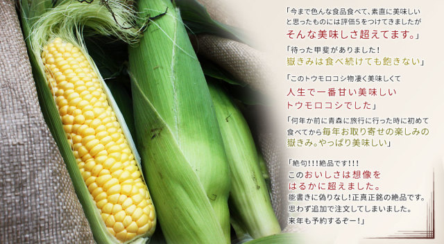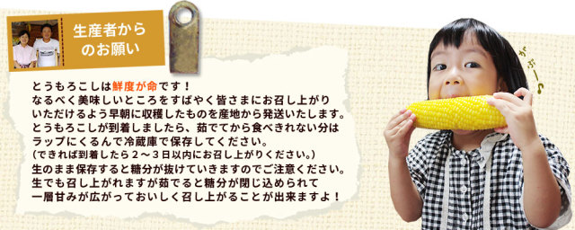 | とうもろこしは鮮度が大切です。なるべく美味しいところをすばやく皆さまにお召し上がりいただけるよう、早朝にもいだものを産地から発送いたします。とうもろこしが到着しましたら、茹でてから食べきれない分はラップにくるんで冷蔵庫で保存してください。(できれば到着したら2-3日以内にお召し上がりください。)生のまま保存すると糖分が抜けていきますので、ご注意ください。生でも召し上がれますが、茹でると糖分が閉じ込められて一層甘みが広がっておいしく召し上がることが出来ます。 |