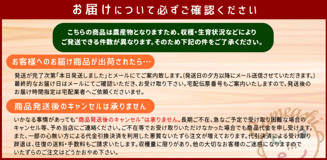 | ご発送は天候やその日の収穫量などに影響され不安定となります。 そのため、期間や曜日の指定(○日までに到着/○日以降の到着/○曜日以外の到着)等は承ることができません。 ※ 「10本入」と「20本入」を、同時にご注文の際規格が異なります為、ご発送日も異なります事をご了承ください。 |