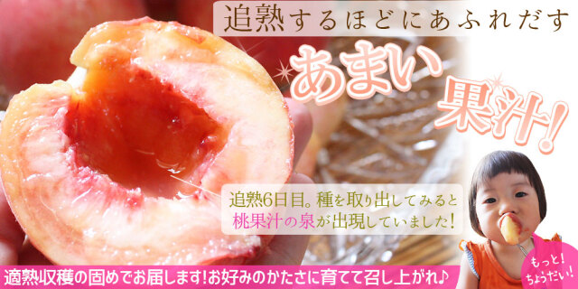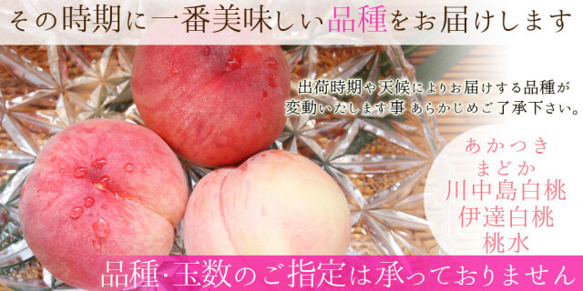 | 7月下旬~9月中旬までの間に、【あかつき・まどか・川中島白桃・あぶくま・伊達白桃・桃水】ご予約順での受付で、その日に【適熟収穫】できた白桃をお届け致します。 品種のご指定は承りませんのであらかじめご了承ください。 |